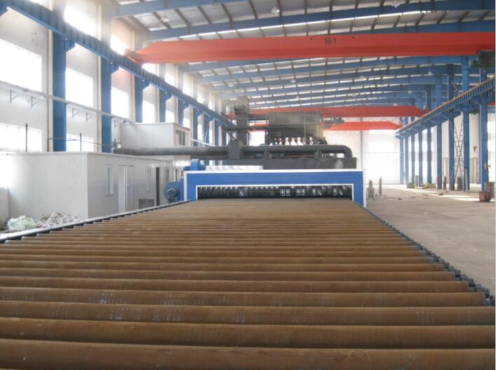 輥道通過式拋丸機是將工件吊放在輸送輥道上,輥道輸送系統(tǒng)將工件向前輸送,當工件進入清理室時,拋丸器開始順序工作。經(jīng)過拋丸處理后,鋼材表面的氧化皮、污物及其它附著物被清理干凈,處理過的工件表面可達Sa2-2.5級。拋丸機的工作方式是連續(xù)循環(huán)進行的。