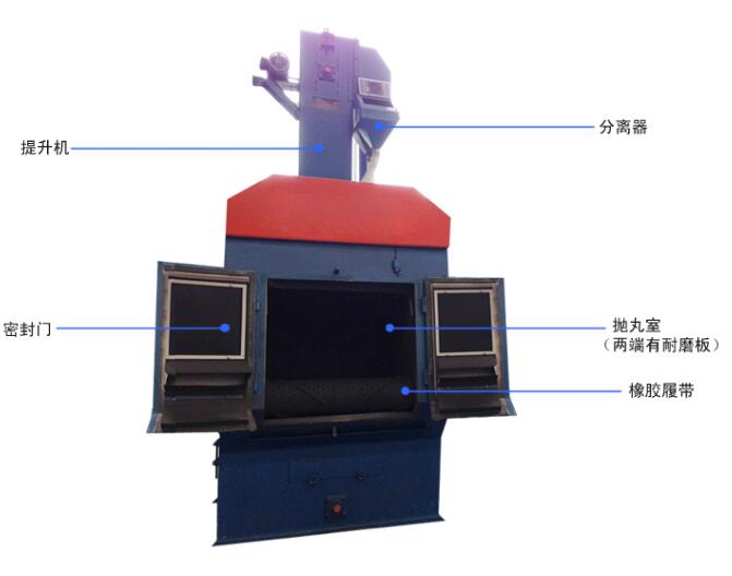 工作原理:在清理室中加入規(guī)定數(shù)量的工件,機(jī)器啟動(dòng)后,工件被滾筒帶動(dòng),開始翻轉(zhuǎn)。同時(shí)拋丸器高速拋出的彈丸形成的彈束,均勻地打擊在工件表面上,從而達(dá)到清理的目的。拋出的彈九及砂粒經(jīng)橡膠履帶上的小孔流入底部的鋼板網(wǎng)過篩,經(jīng)螺旋輸送器送入提升機(jī)內(nèi),由提升機(jī)提到分離器中進(jìn)行分離。粉塵由風(fēng)機(jī)吸送到除塵器中過濾,清潔空氣排入大氣中,布袋上的灰塵經(jīng)機(jī)械振打,落入除塵器底部的集塵箱中,用戶可定期清除,廢砂由廢料管流出,用戶可回收利用。丸砂混合物由回用管回收進(jìn)入室體,待分離器分離后再回用干凈的彈丸由供丸閘門進(jìn)入拋丸器拋打工件。
